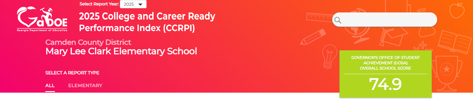 Access the full Governor's Office of Student Achievement (GOSA)MLCES report by clicking here: https://public.gosa.ga.gov/noauth/extensions/SchoolGrades-Georgia/SchoolGrades-Georgia.html?lang=English&SchoolName=mary-lee-clark-elementary-school [public.gosa.ga.gov]